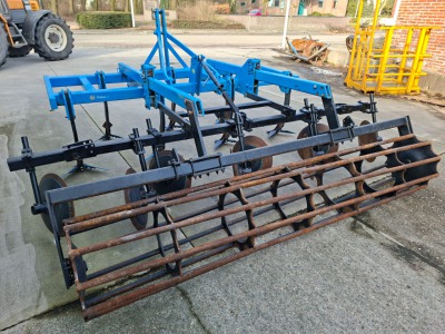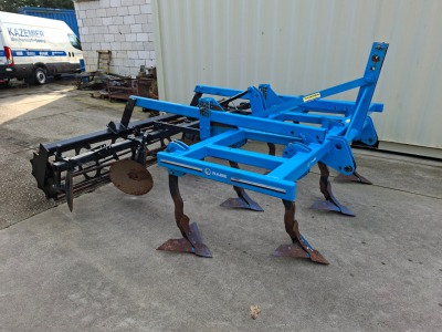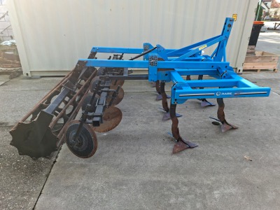 Rabe Grubber GH 3000 2-rijen met 7 beitels met overlap. 75cm framehoogte. 25cm Werkdiepte maximaal. Kooirol, 540mm diameter. Set holle schijven met kantschijven, 460mm. Schijven induviduel en centraal in hoogte verstelbaar. Schijven in hoek verstelbaar. Gewelfde stelen met breekboutbevestiging. Grond loopt niet tegen de stelen en geringe verstoppingsgevaar. Zeer nette slijtdelen. Geen speling op de schijven. Alles gangbaar. Optioneel leverbaar met een zaaibak/strooier. |